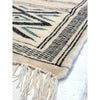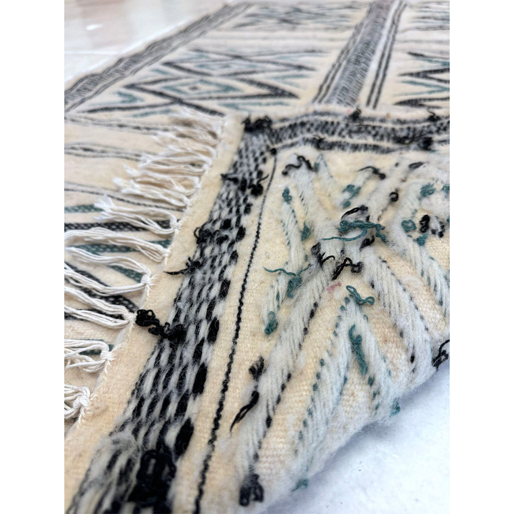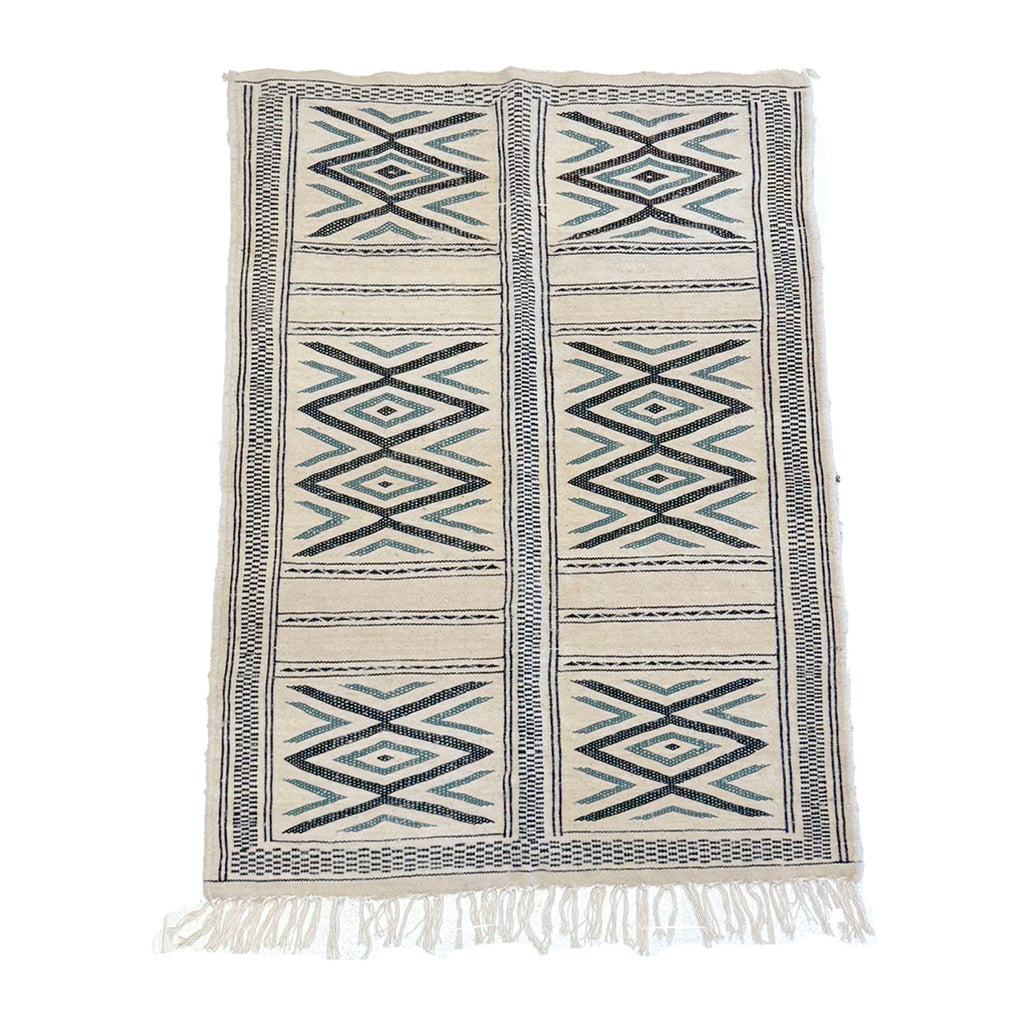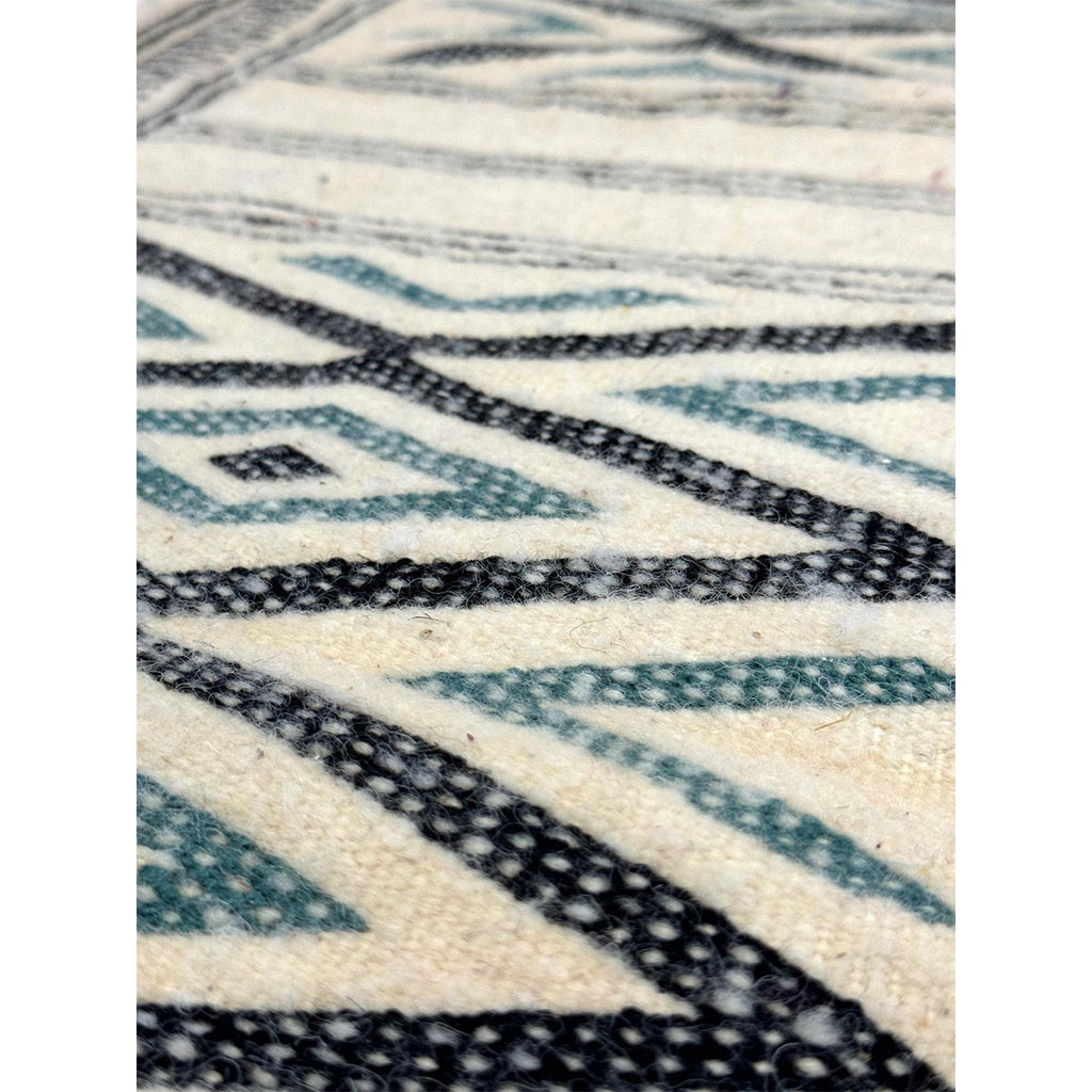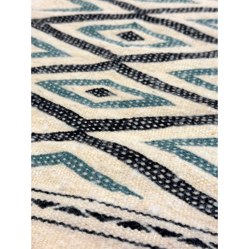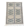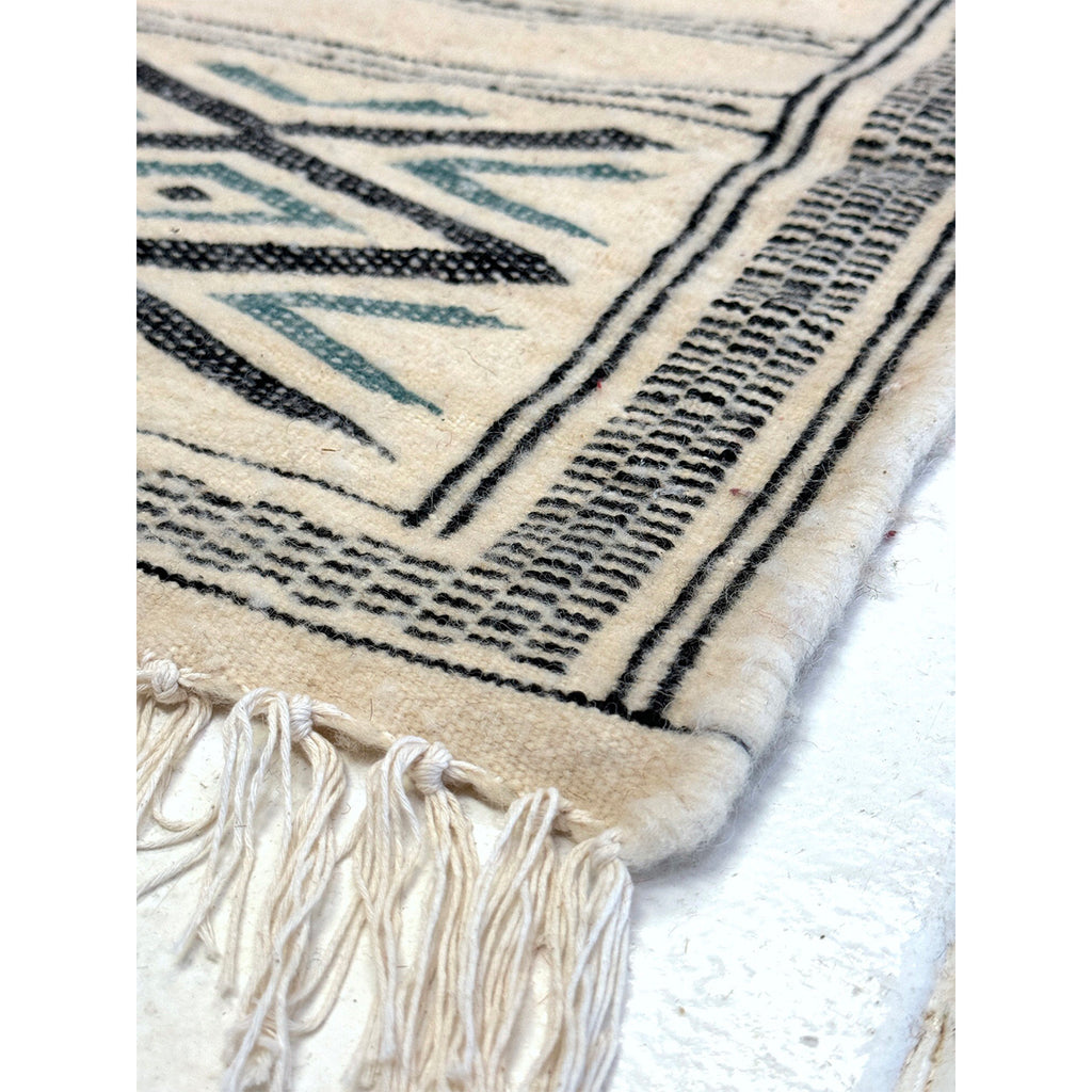 This small Moroccan flatweave rug is woven by our artisan partners in the Middle Atlas mountains. Their weaving style often features tightly woven, geometric designs that are symmetrical from one side to the other. This rug represents a modern rift on an old design; the artisans play with negative spacing and color in a sophisticated way that blends the old and the new. A rug that is this size will look best as a bedside runner, a bathroom rug, a rug for an entranceway, or in a smaller nursery or office.