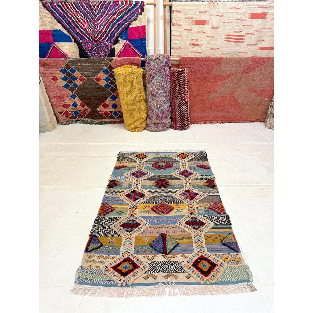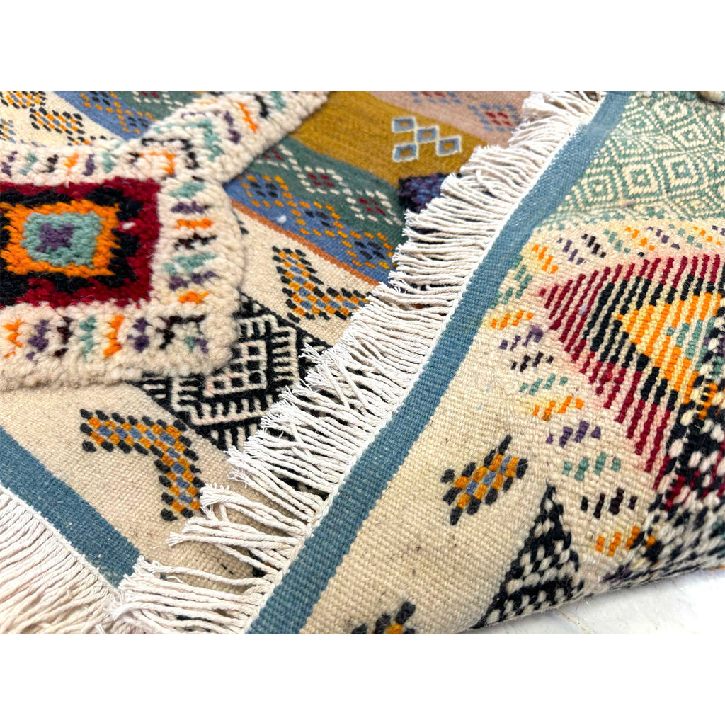 The simplest, time-tested method is straight from Morocco: hang your rug in the sun for a few hours, then shake it out well before bringing it back inside. This regular airing out is the best way to keep your rug fresh and dust-free. Beyond that, care depends on the rug’s material and construction. For instance cotton boucherouites are the easiest to clean - just throw them in the washing machine on a gentle cycle and air dry. Longer pile rugs should be vacuumed with care. Be sure to turn off the rotating brush or switch to the “carpet” setting before vacuuming the top side. For more information click here.