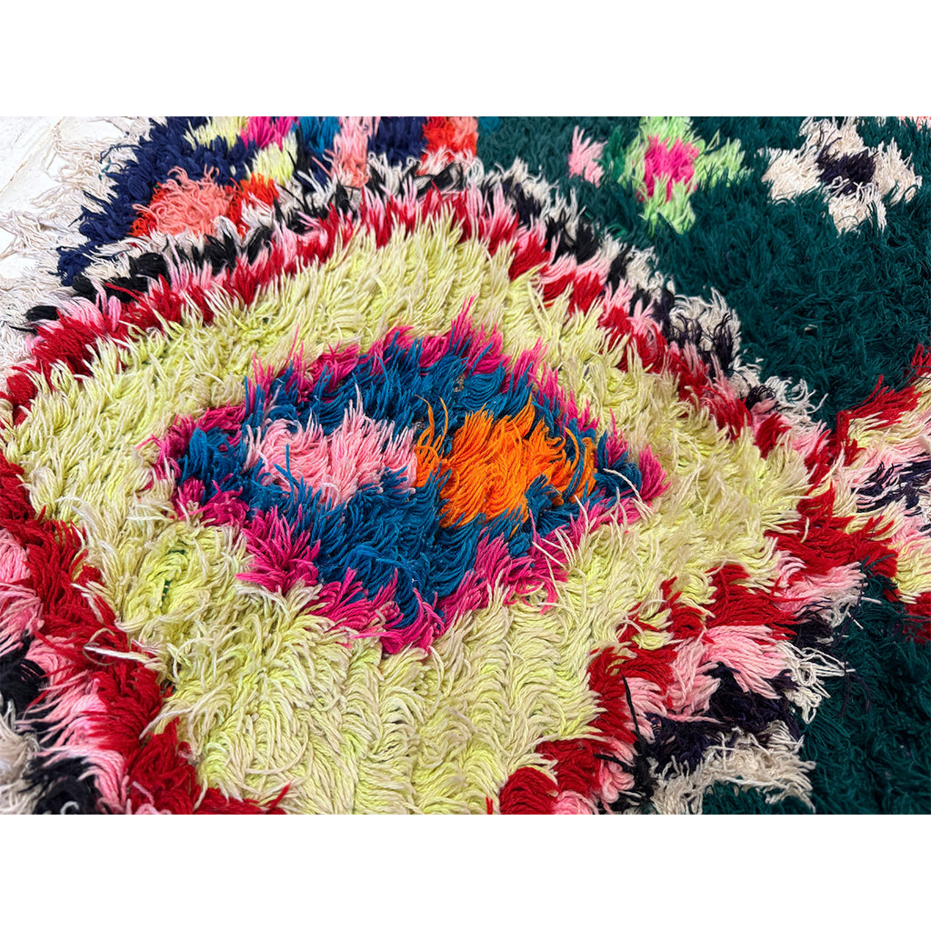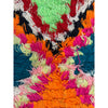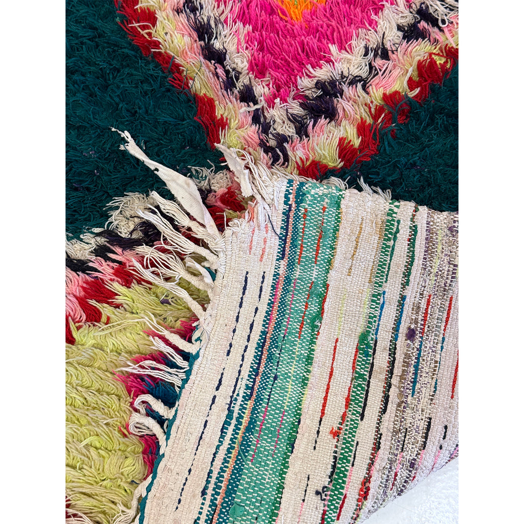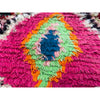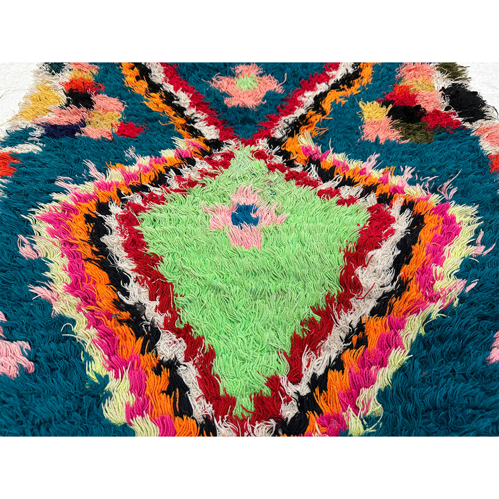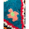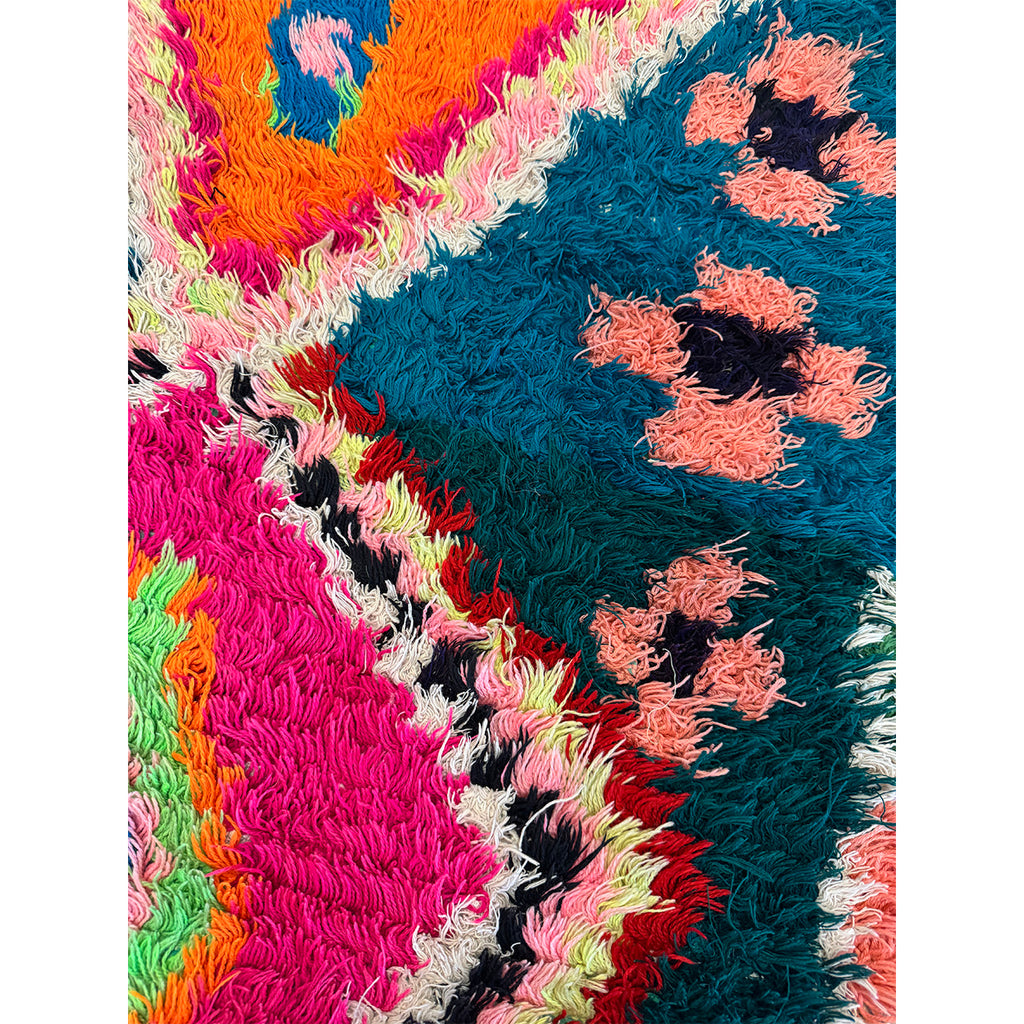 This rug is super playful with its bright colors and longer shag. It's made in the boucherouite style. With this style, the artisans use up their left-over pieces cotton to make these wildy artistic rugs. Because boucherouites are rarely woven with wool, they're easier to clean up, making them great rugs for high traffic areas. This would make a great kitchen rug, or place it in a wider hallway.