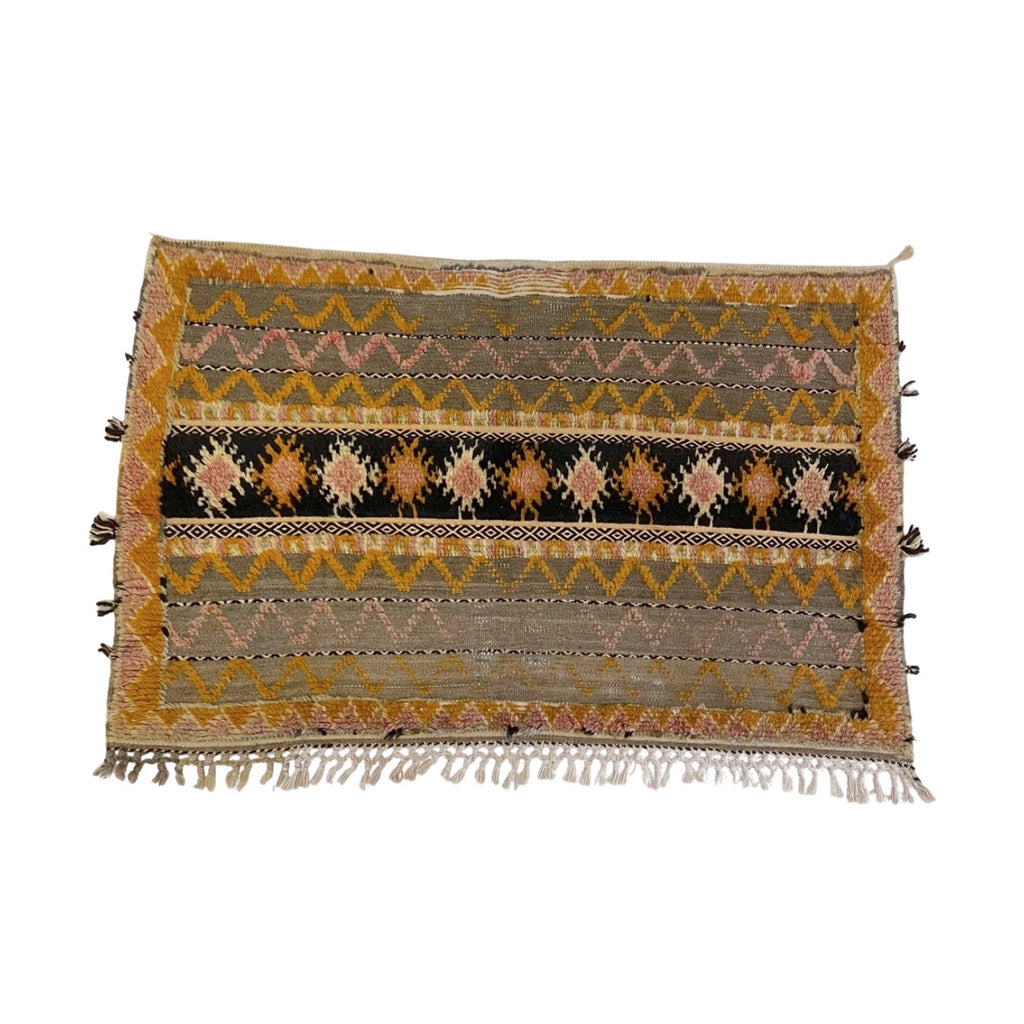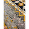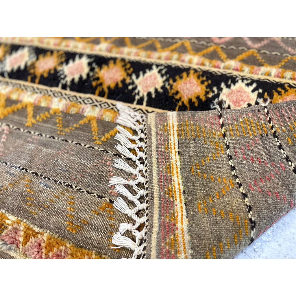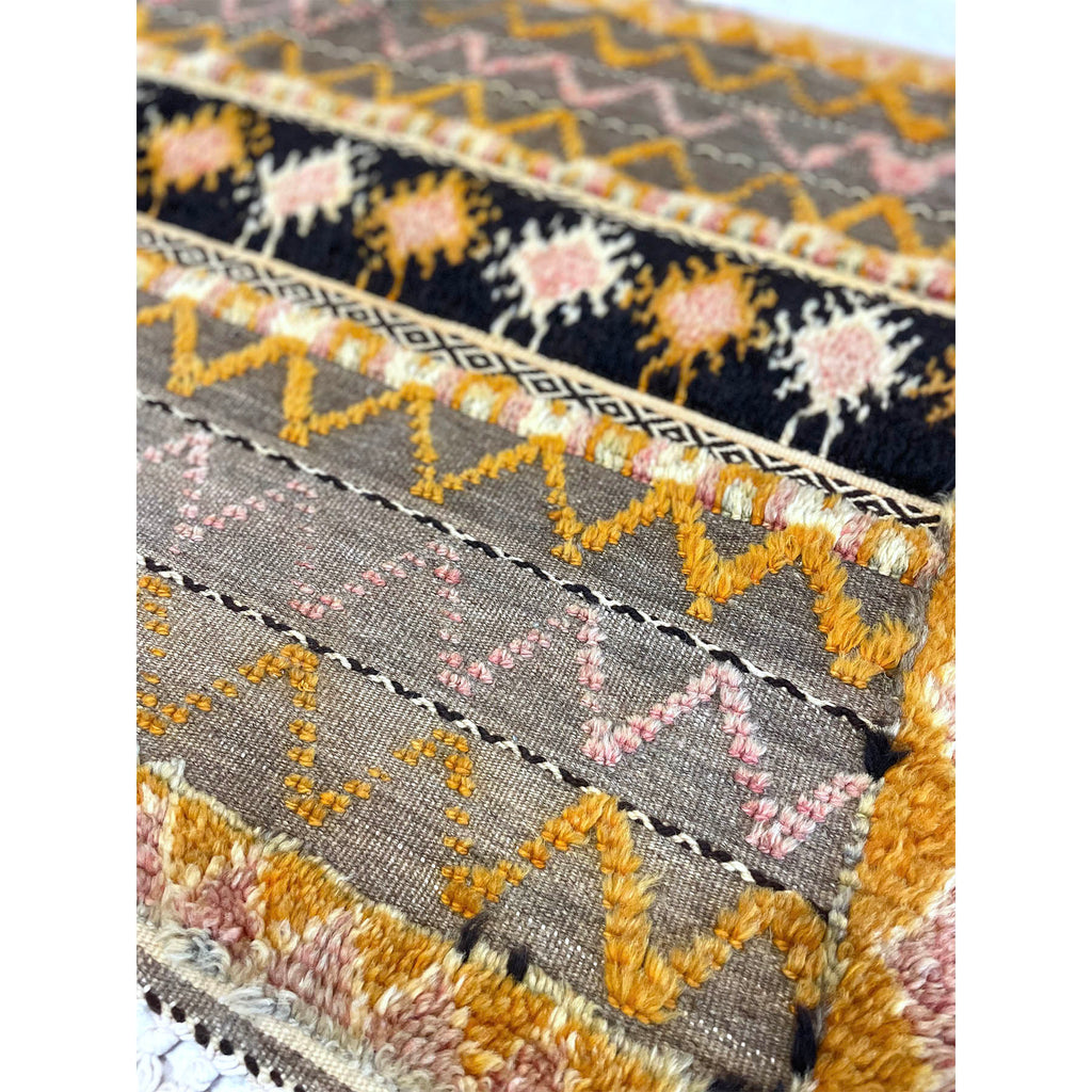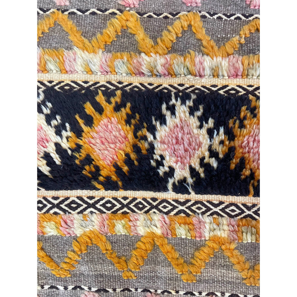 An old Glaoui rug that features a mix of different weaving styles. The grey base is a flatweave. Some of the detail work is hand knotted, appears in orange and pink, and has been worn down with age. Other black and white bands run through the rug and feature the Zanafi weaving style. This is a long and short rug, perfect for the foot of a bed, or as a kitchen rug.