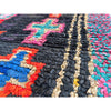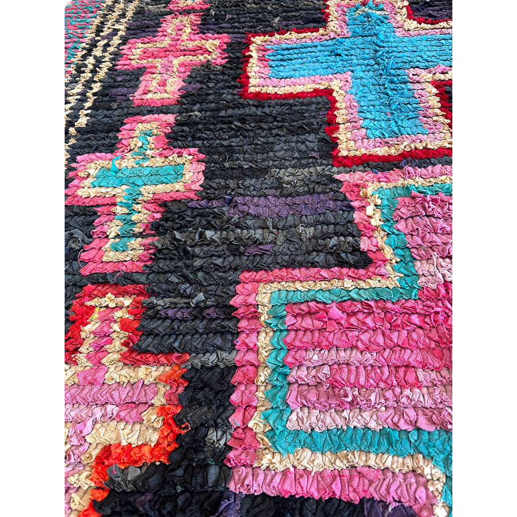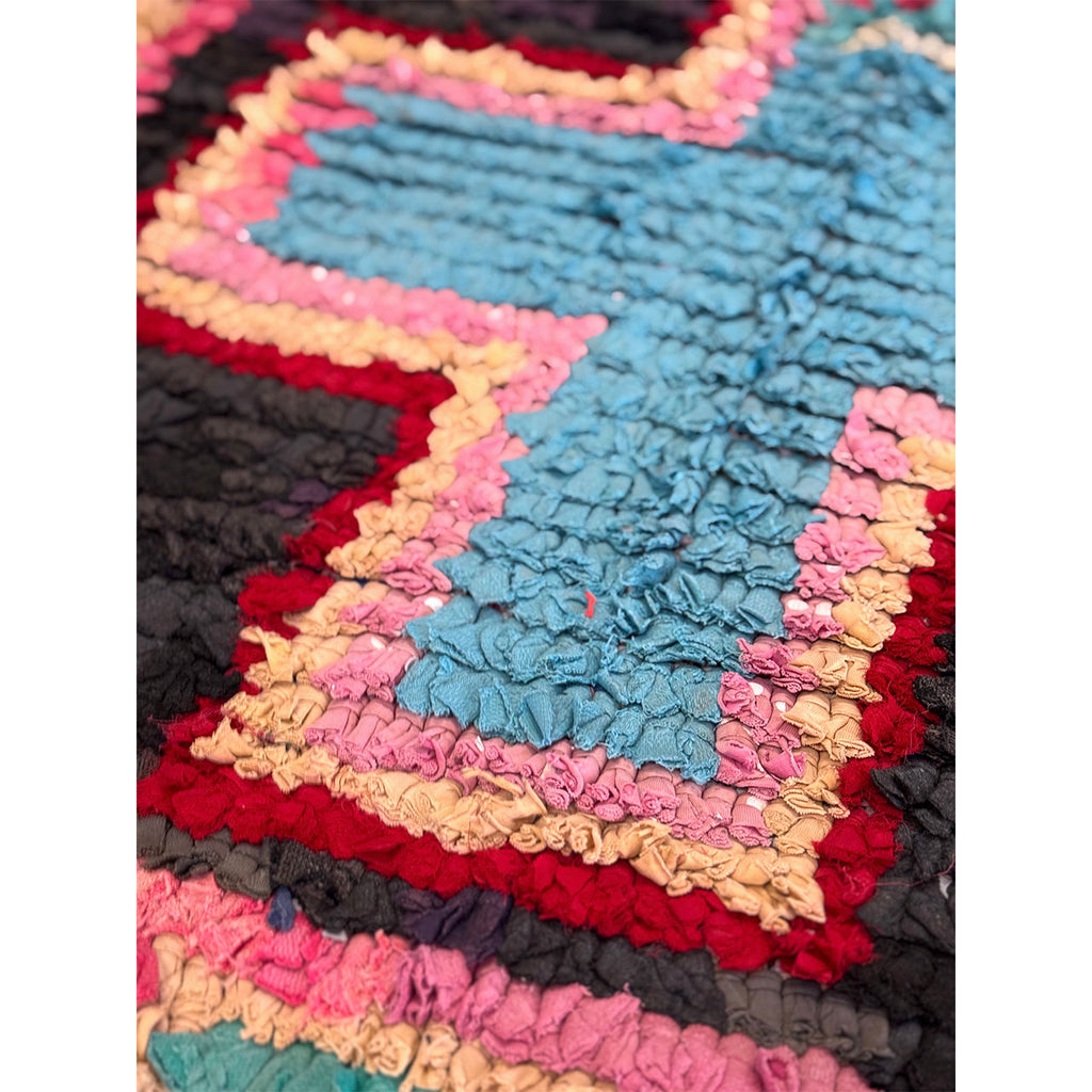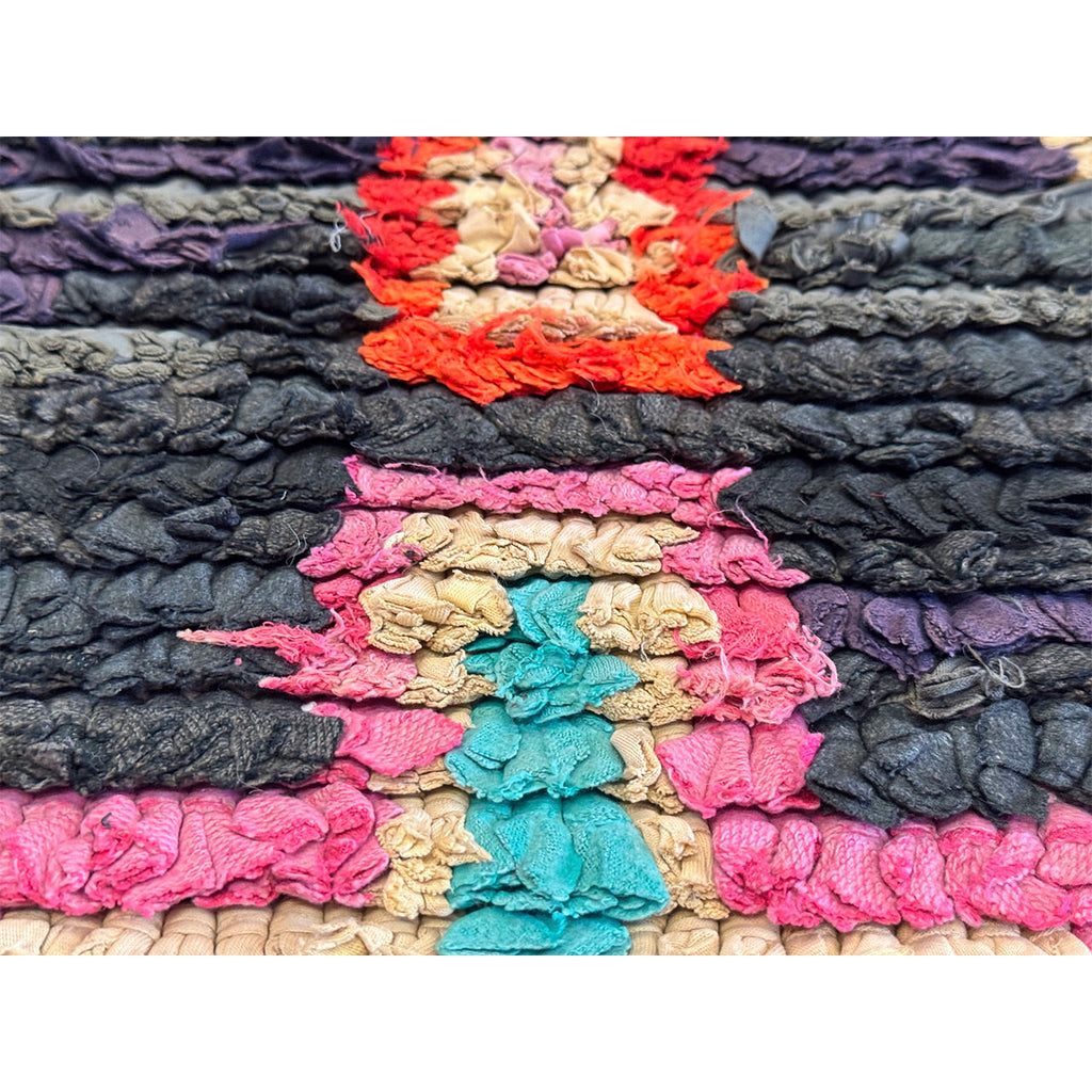 This is a classic boucherouite rug. While some of the newer boucherouites are made from colorful cotton, this one is made entirely from upcycled cloth and textiles. Women all over Morocco weave these rugs as it's a way for them to use up their leftover materials. If they need more cloth, they might buy used clothing at the weekly souk (market). From there, they would deconstruct the clothing until they have a fiber they can weave with. This rug is a result of that process. Because this rug is woven with cloth, it's more durable than a wool rug. It's also easier to clean, which makes it a great rug if you have small children, pets, or need something for a high traffic area.