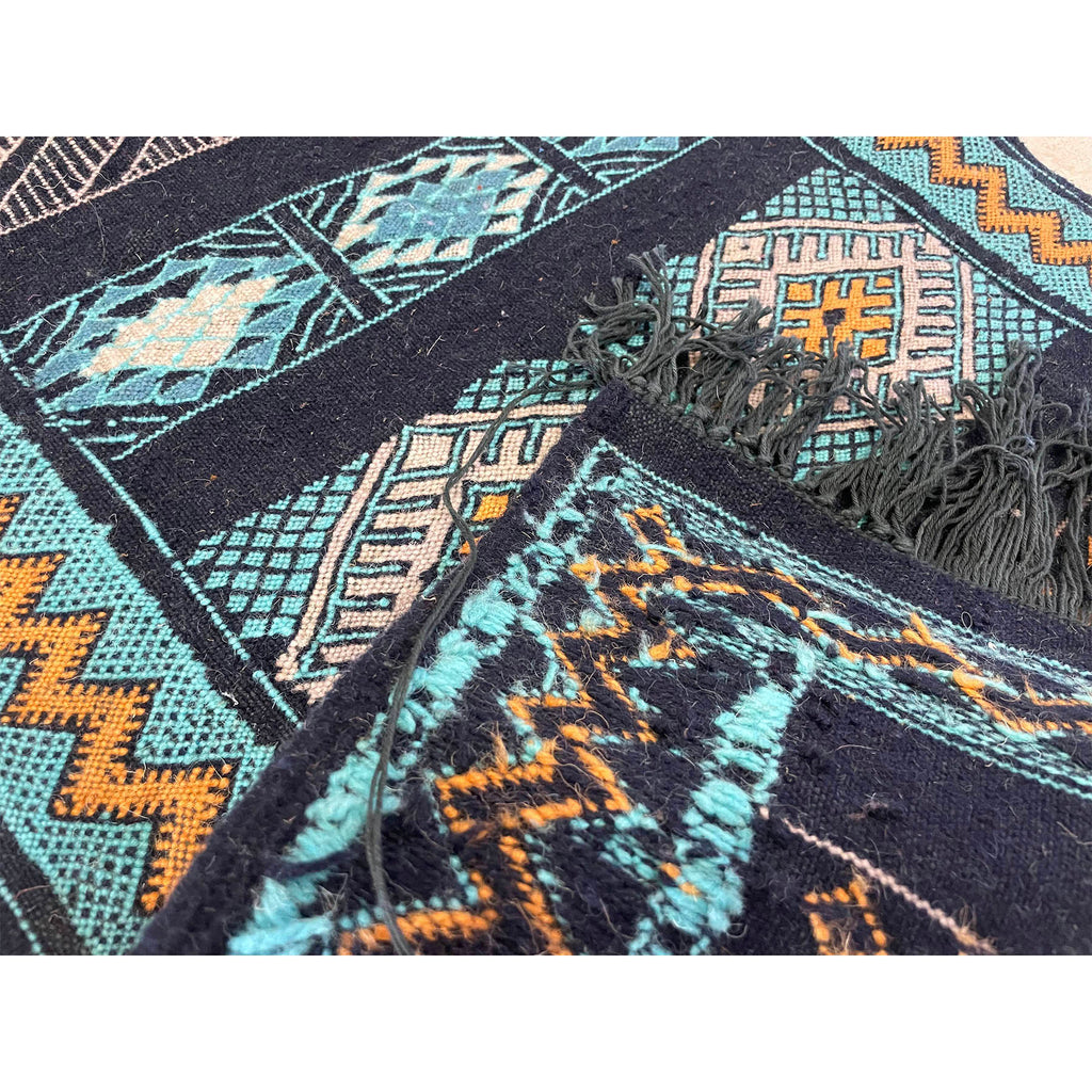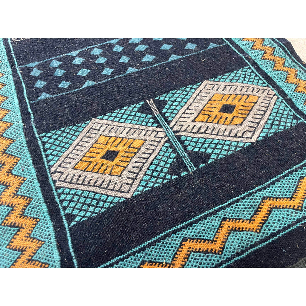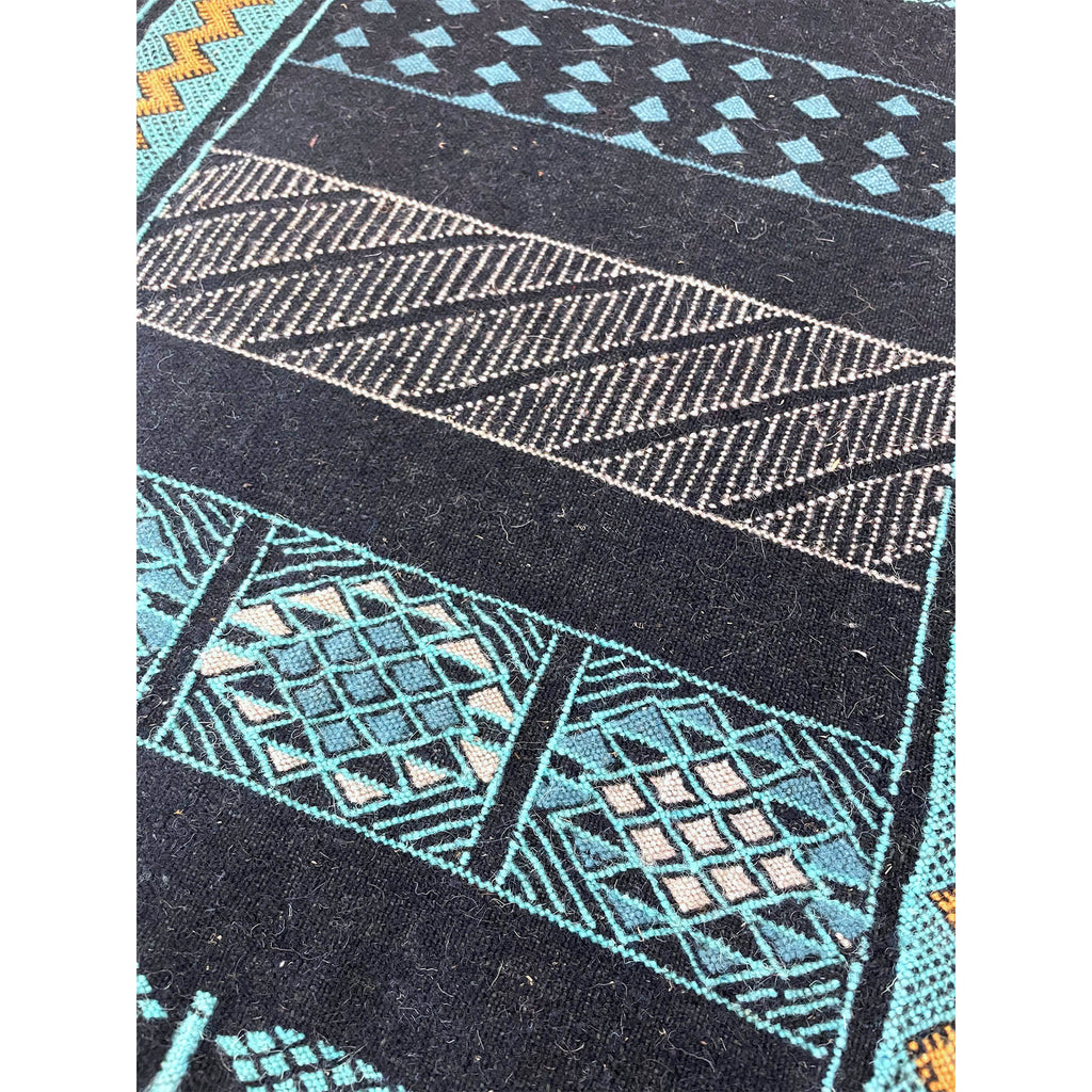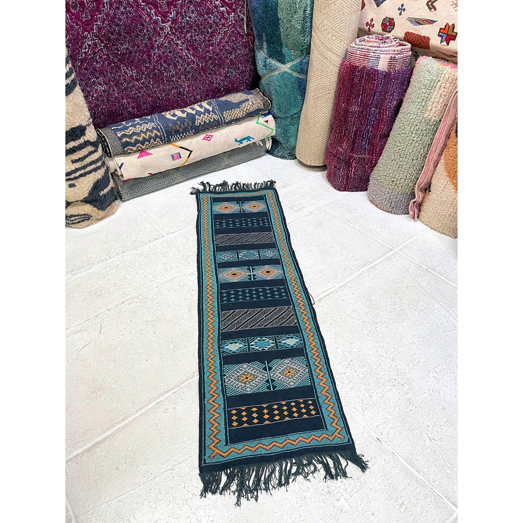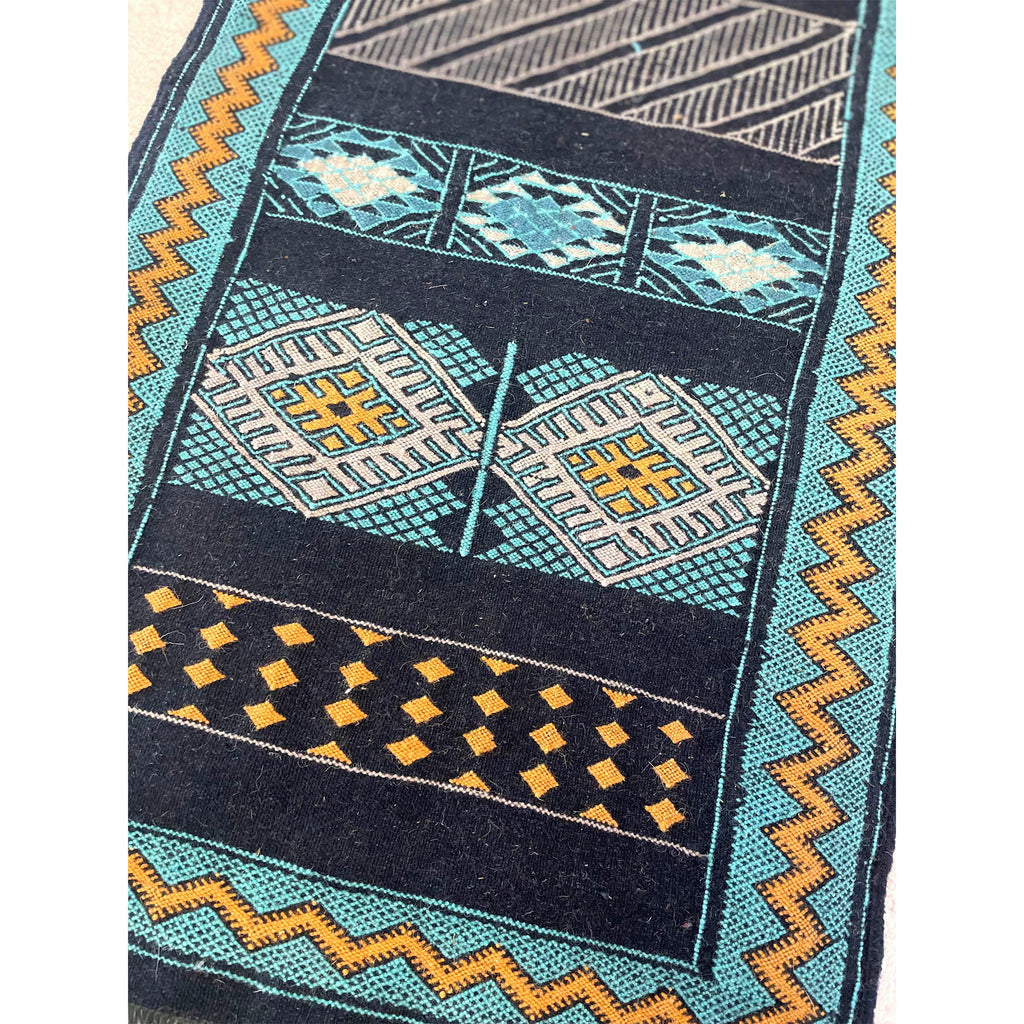 We designed this flatweave runner to be on the narrow side. A perfect bedside runner for those beds with stubbornly small spaces on either side. We worked with our artisan partners in the Middle Atlas mountains to come up with a color palette that complemented their traditional design style. We love how the bright yellow pops against the navy blue and teal. A small runner, yet versatile, this piece can be placed next to a bed, as a kitchen runner in front of the sink, or in a long bathroom.