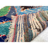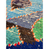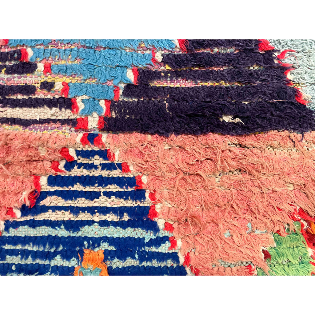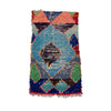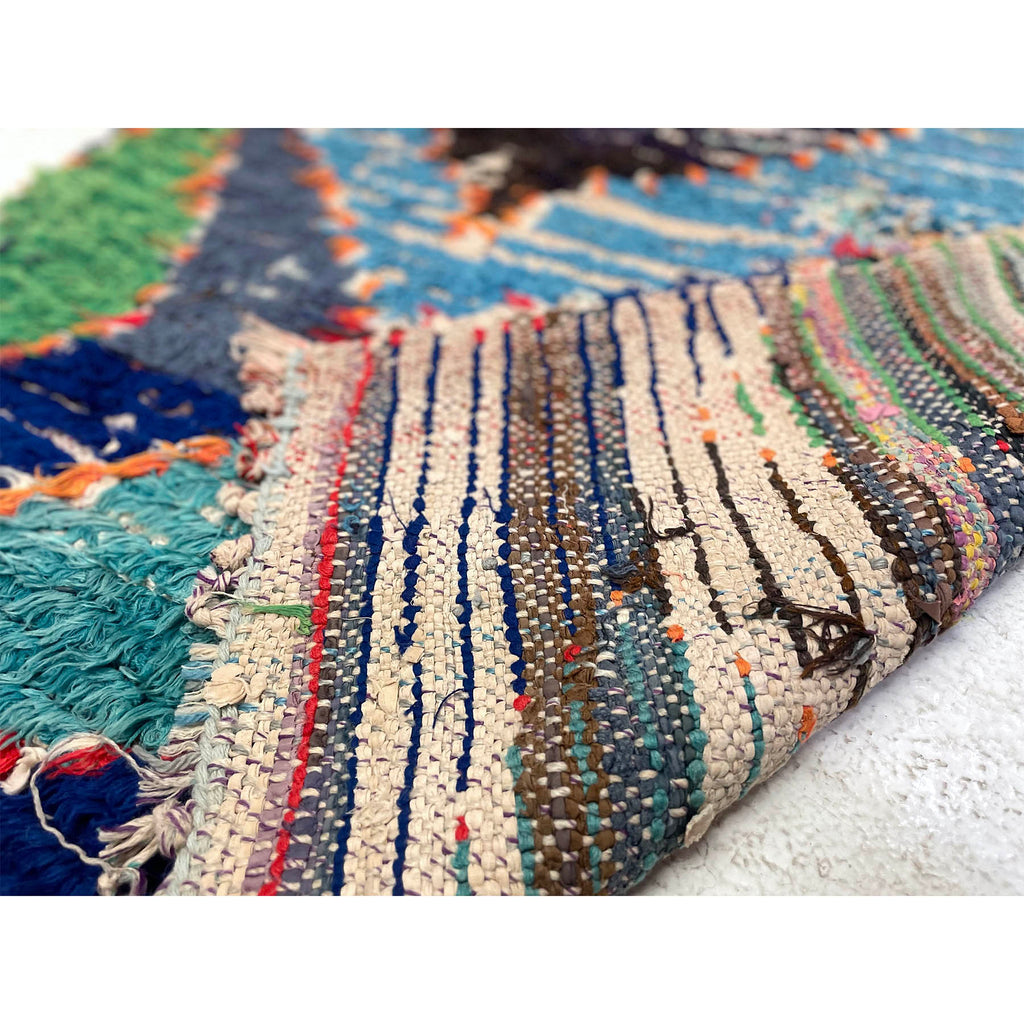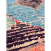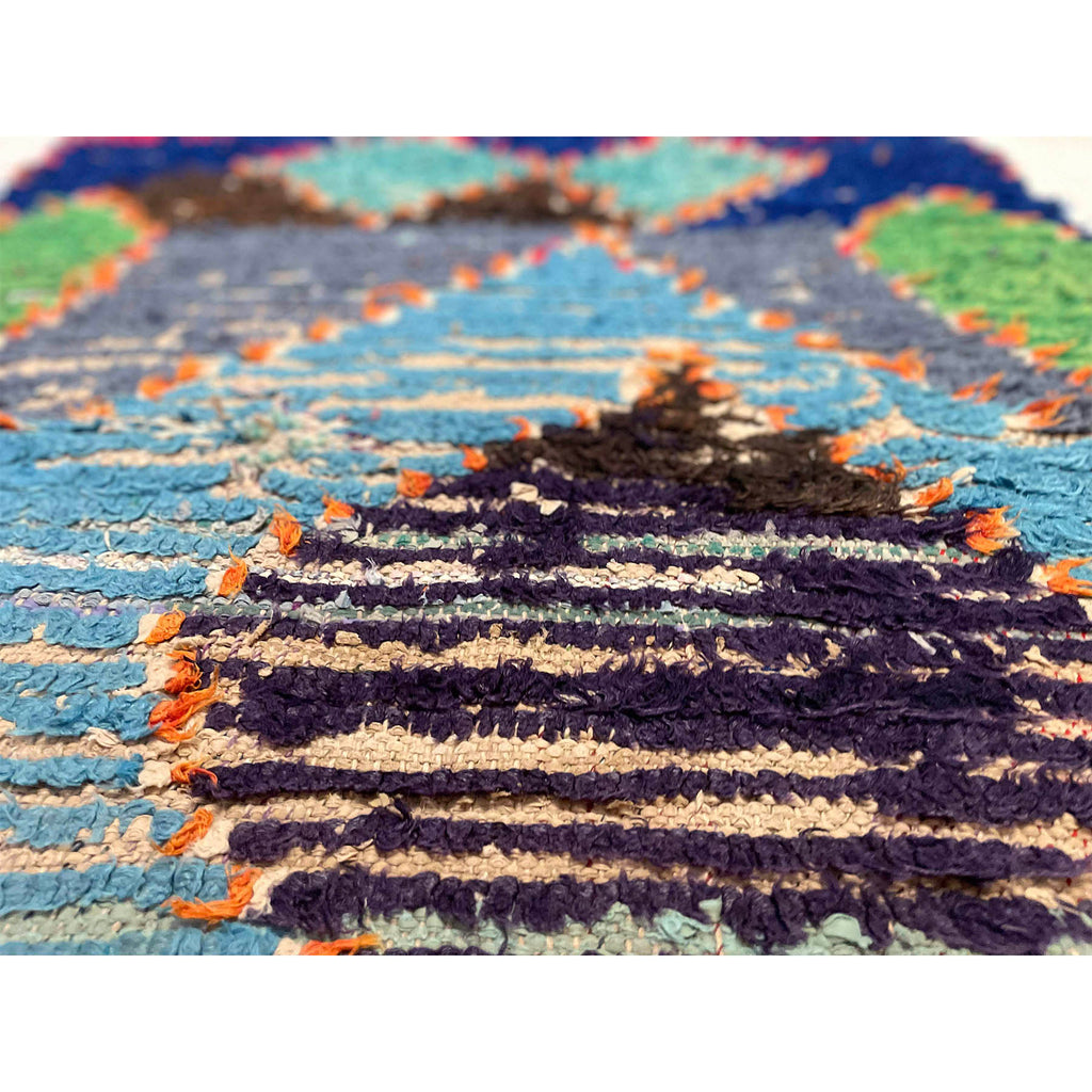 This throw rug is an older Boucherouite rug that plays with several unique shades of blue -- from navy, to sky-bue, to indigo. Boucherouites gained notoriety as rag rugs and often feature a mix of cotton and wool. In some parts, the hand knotted pile has been worn down with age, giving the rug a true vintage feel. Because of their cotton fibers, these rugs are slightly easier to clean than wool rugs, which make them great rugs for kitchens, bathrooms, or for kids' rooms.
