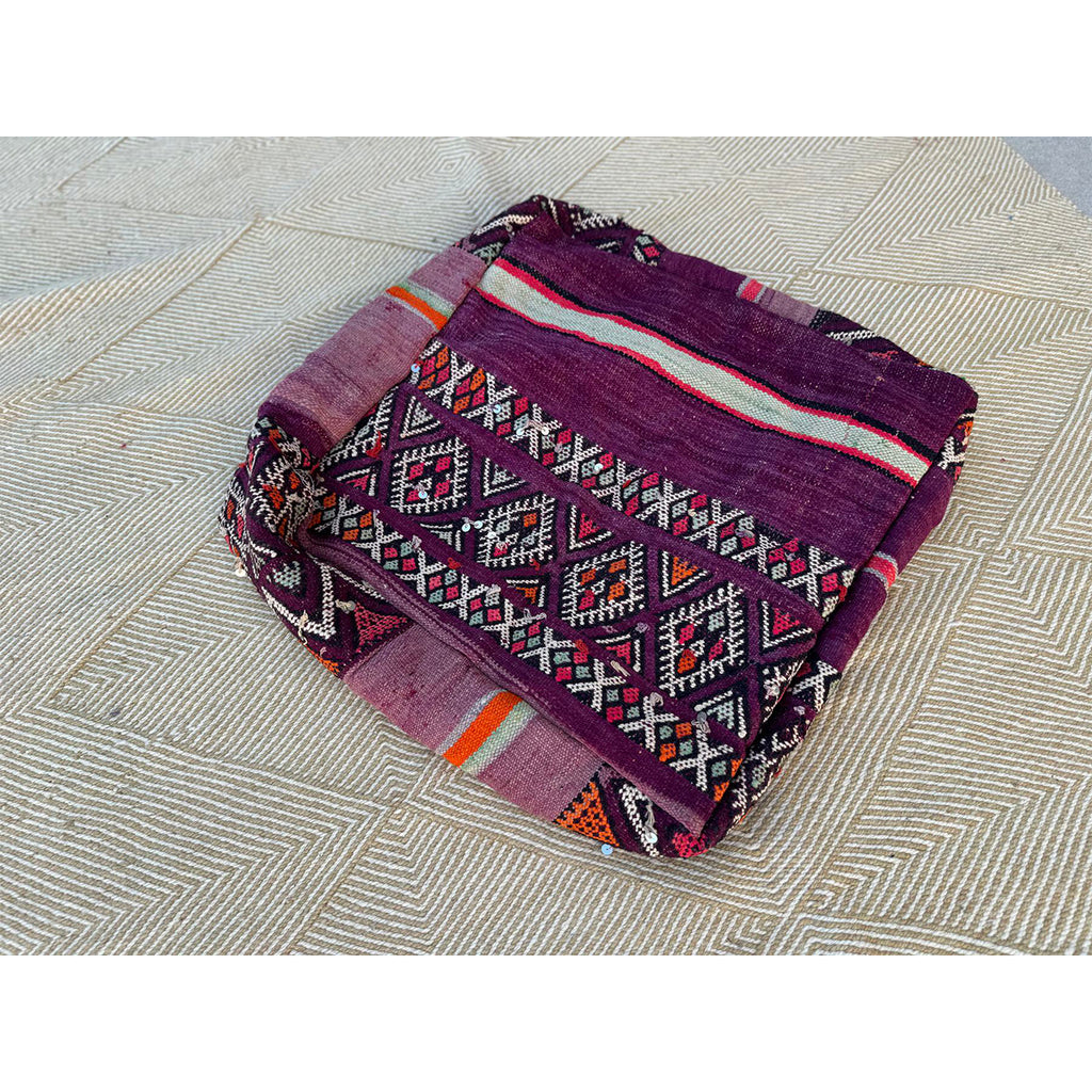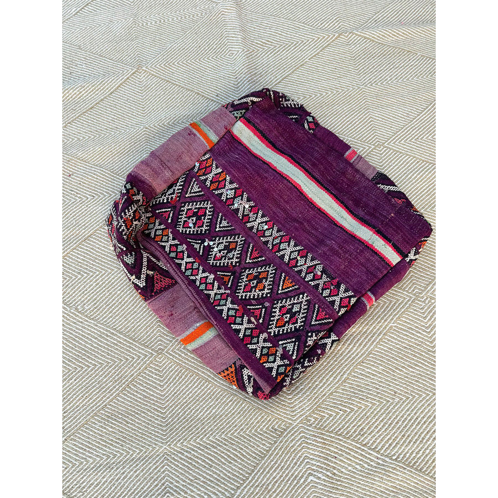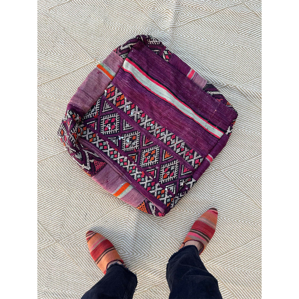 This pouf is made by Jamal and Kamal, from a vintage Moroccan rug. Stack two of them together for added height, or just use one as a meditation pillow, or low floor pouf
