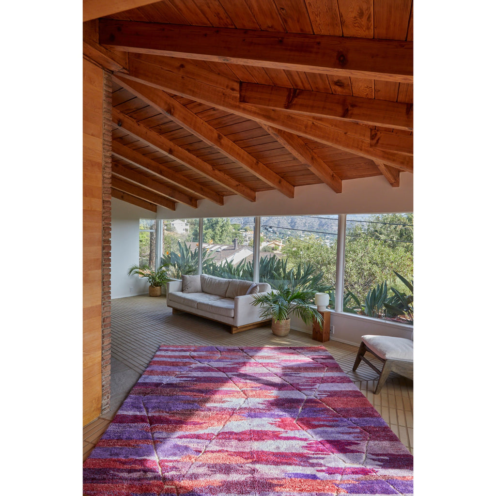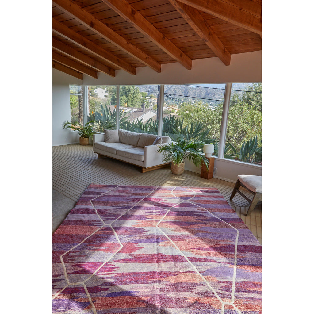 A contemporary take on the classic Beni Mrirt design, this Moroccan area rug features geometric inlaid lines against an abstract base. The unique color palette of this piece adds another dimension to the pattern with a collection of reds, pinks, and purples. Colorful and warm, this Beni Mrirt Moroccan rug would be perfect for a living room or bedroom.