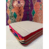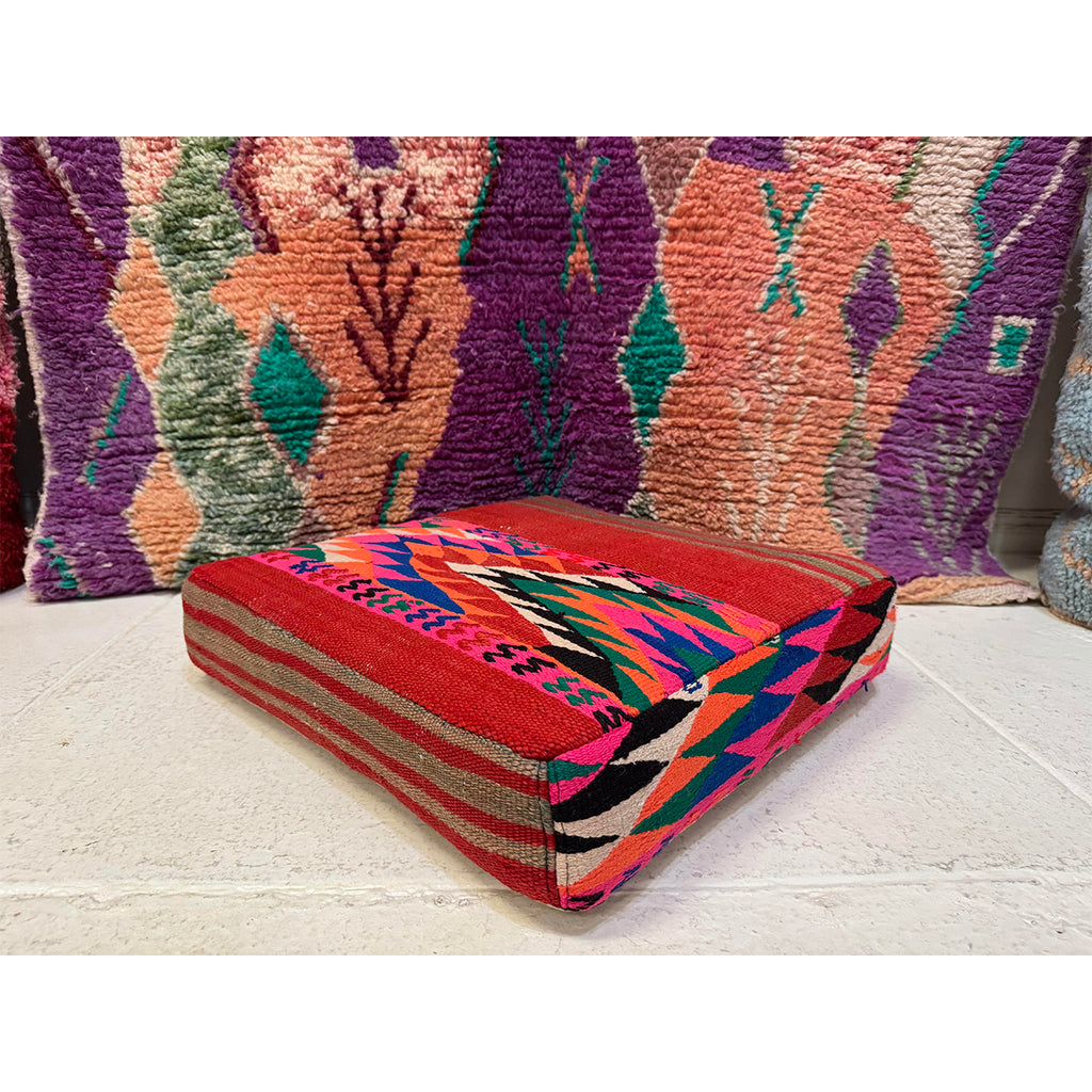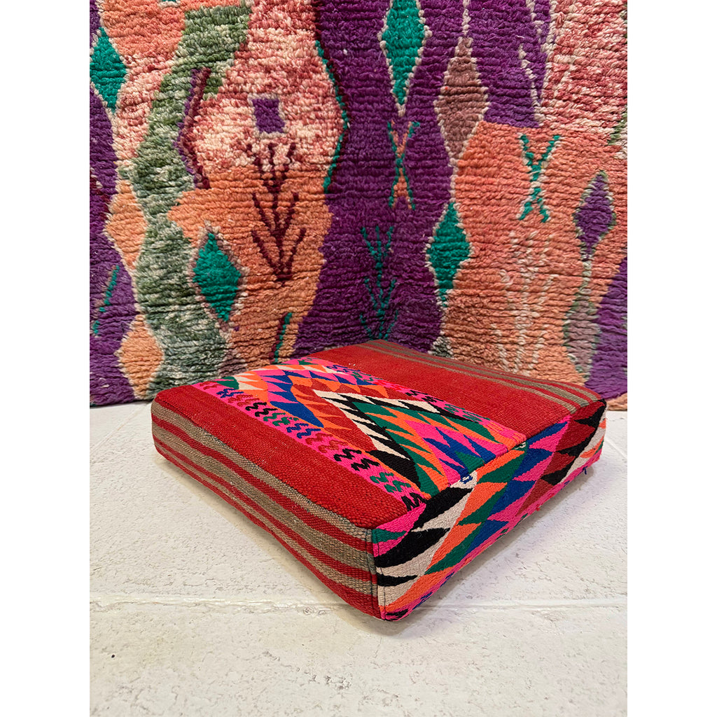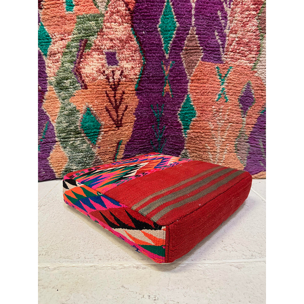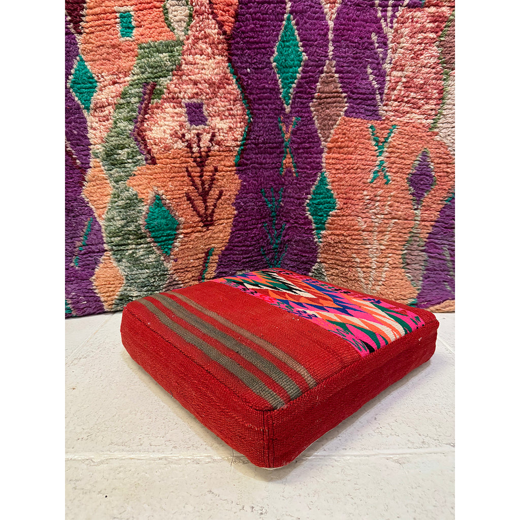 This pouf is one in a set of two made from a vintage Moroccan blanket. The soft wool pile of the original blanket makes for cozy pieces. Stack two of them together for added height, or just use one as a meditation pillow, or low floor pouf.