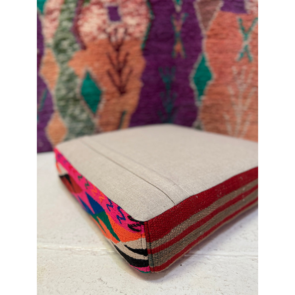 With a linen base in oatmeal color and a colorful red, pink, green, and blue top and sides, this pouf would be perfect as an accent piece for a space in need of a touch of vibrancy.