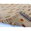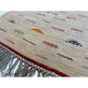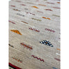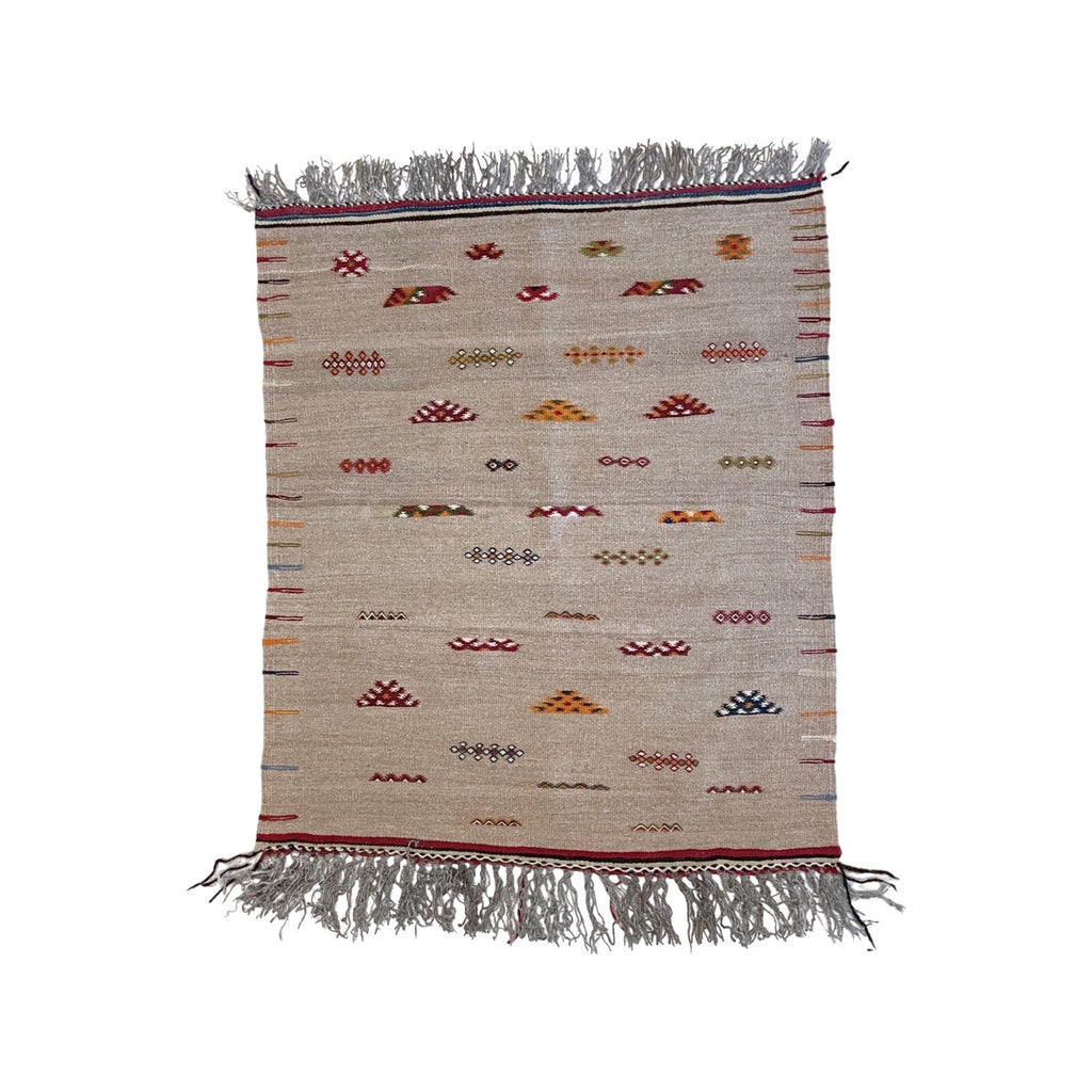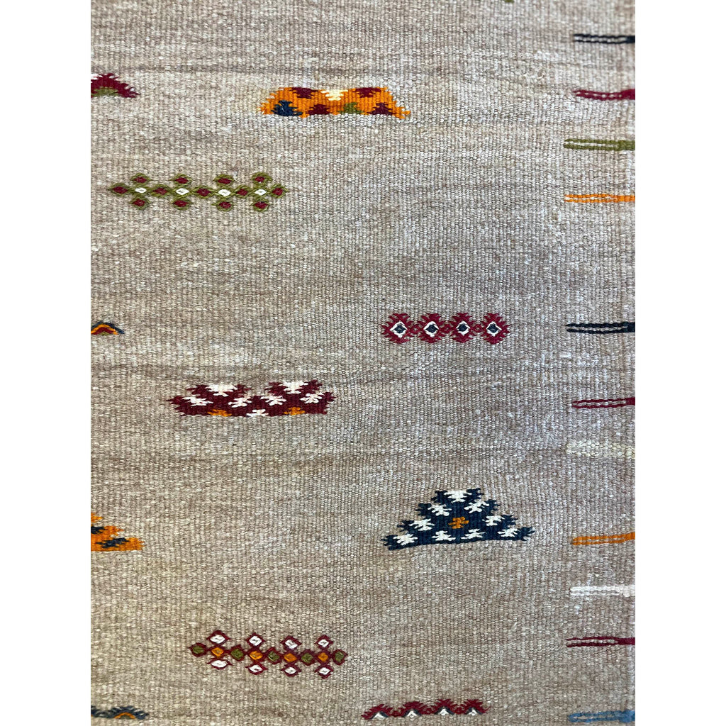 A small grey Akhanif rug from Morocco's southeast desert region. This piece features a playful field of colorful motifs. The border is filled with multicolored lines that march up the edges of the rug, in a ladder-like formation. This rug would be great as a rug in a kids' room, or as a bathroom or kitchen rug. This is one of two Akhanif rugs that we have in similar colorways, and can be custom ordered to larger sizes.