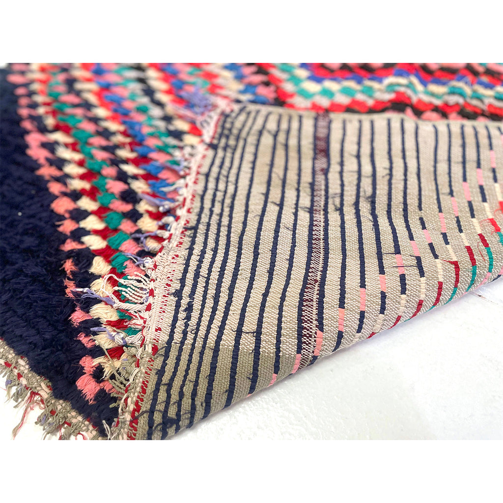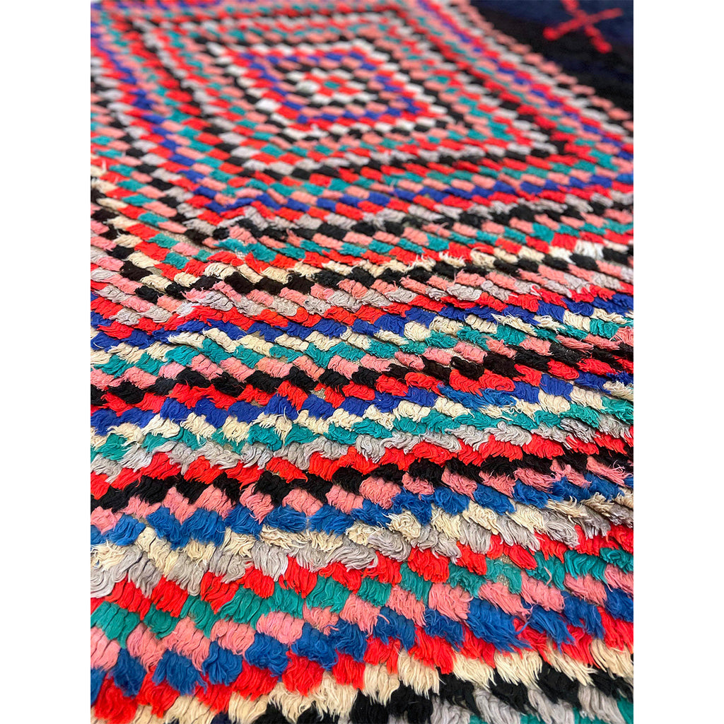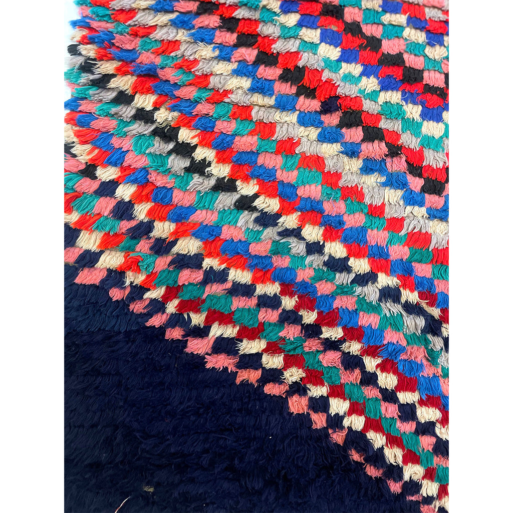 This Moroccan boucherouite rug is a contemporary piece, woven with colorful cotton fiber. The bulk of the design is made up of a hypnotic, checkered diamond pattern on top of a navy blue base.The contrast between the dark base of the rug and the colorful fibers that make up the diamond is notable. Boucherouites gained notoriety as rag rugs that used up leftover fibers and colors. They often feature a mixture of cotton, wool, and fabric. Rugs like this one that are made out of cotton are easier to clean than wool rugs. This makes them great rugs for kitchens, bathrooms, kids' rooms, or in households with pets and small children where spills and accidents might occur.