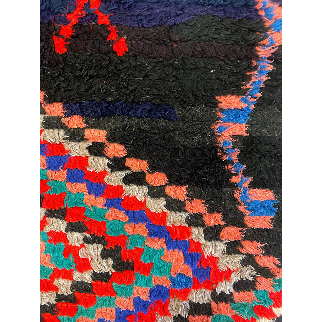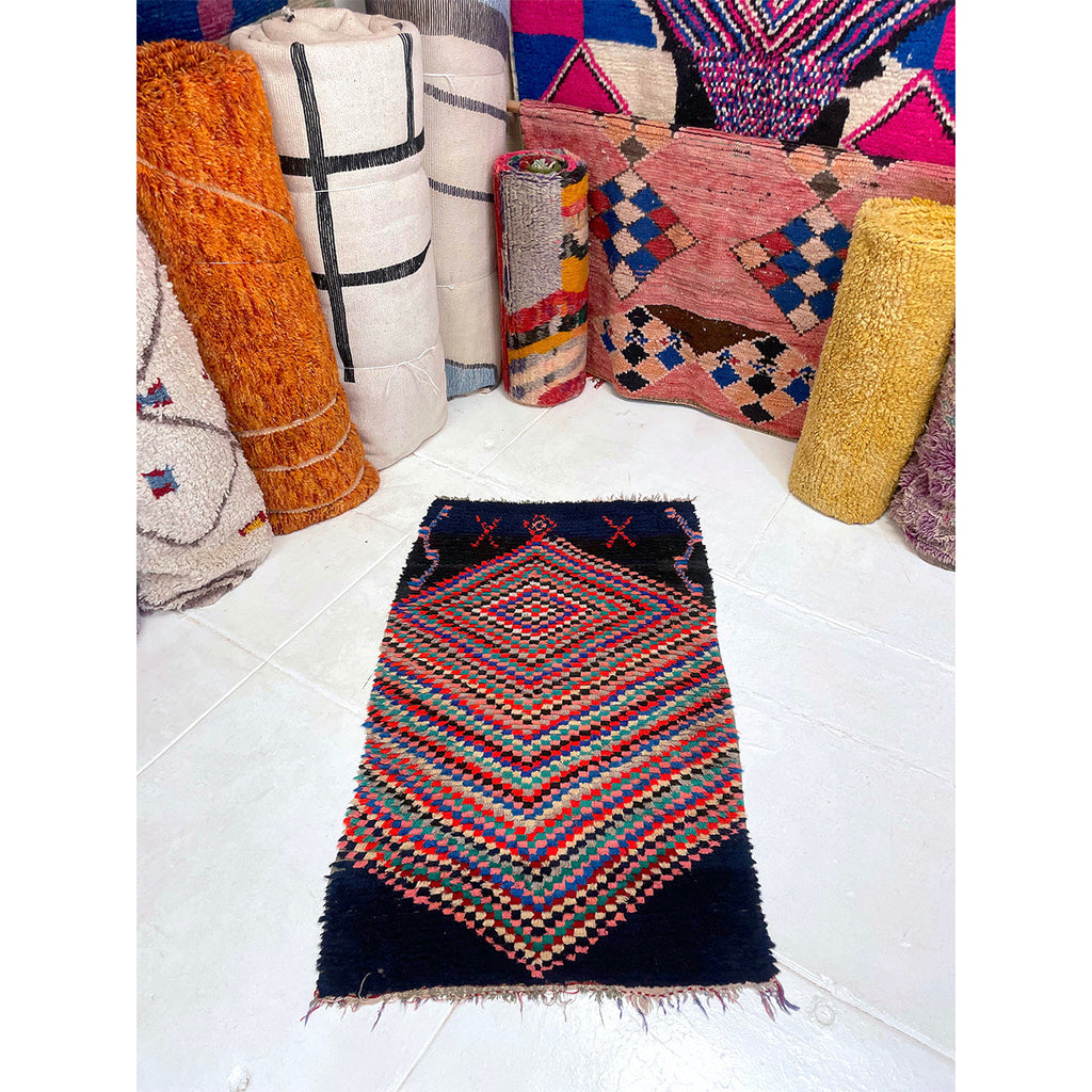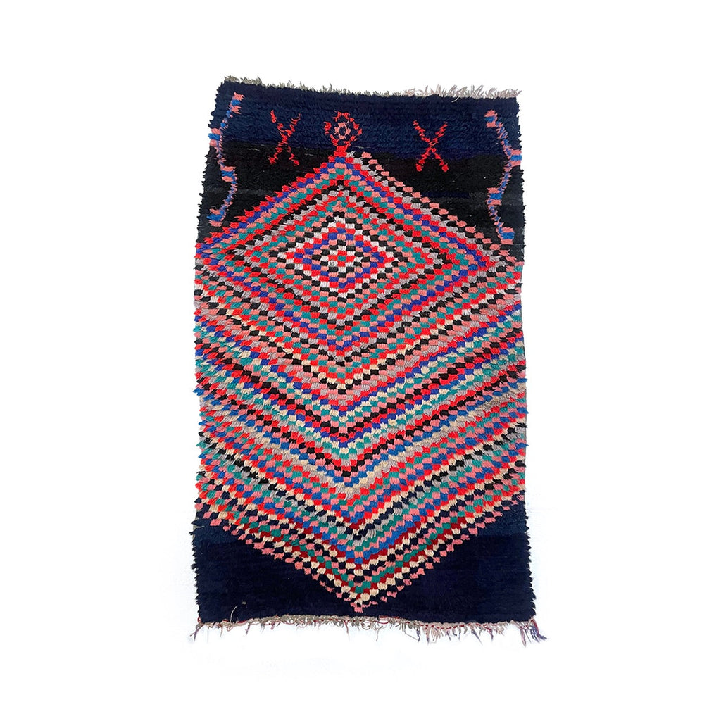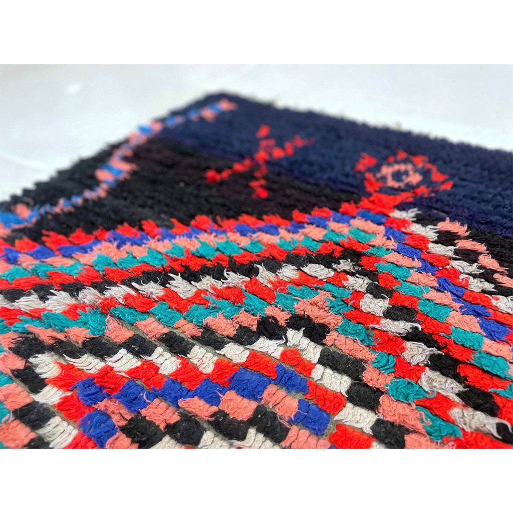 This Moroccan boucherouite rug is a contemporary piece, woven with colorful cotton fiber. The bulk of the design is made up of a hypnotic, checkered diamond pattern on top of a navy blue base.The contrast between the dark base of the rug and the colorful fibers that make up the diamond is notable. Boucherouites gained notoriety as rag rugs that used up leftover fibers and colors. They often feature a mixture of cotton, wool, and fabric. Rugs like this one that are made out of cotton are easier to clean than wool rugs. This makes them great rugs for kitchens, bathrooms, kids' rooms, or in households with pets and small children where spills and accidents might occur.