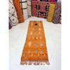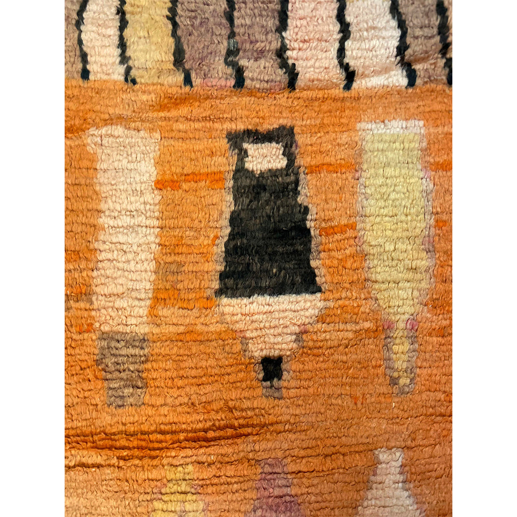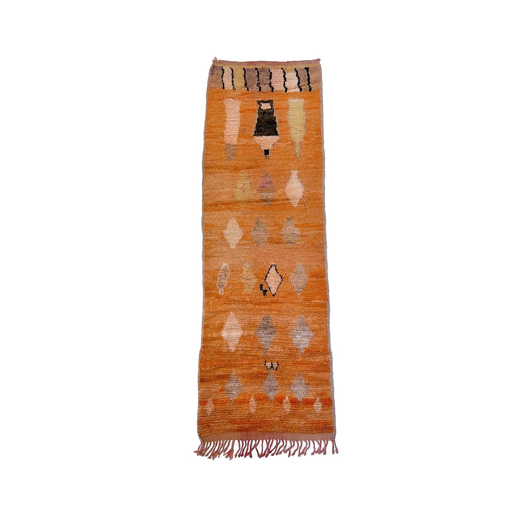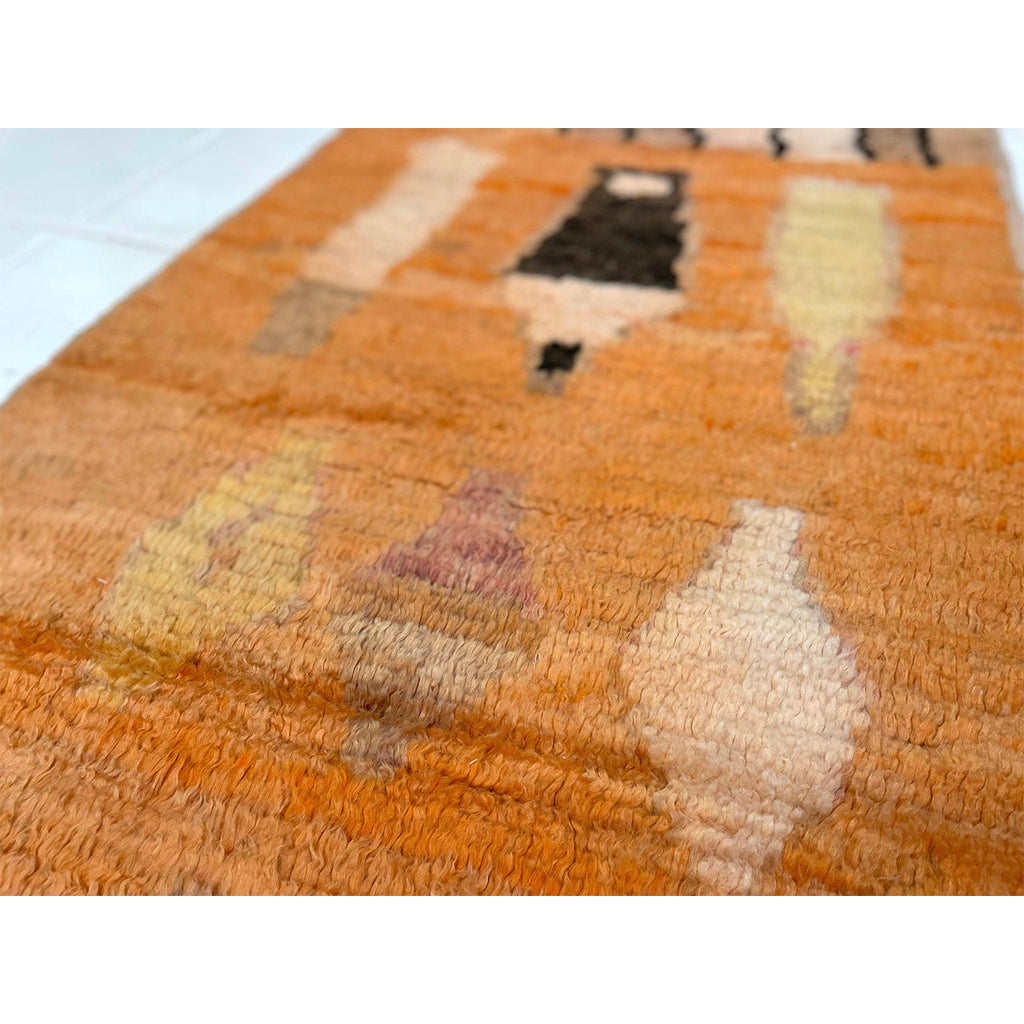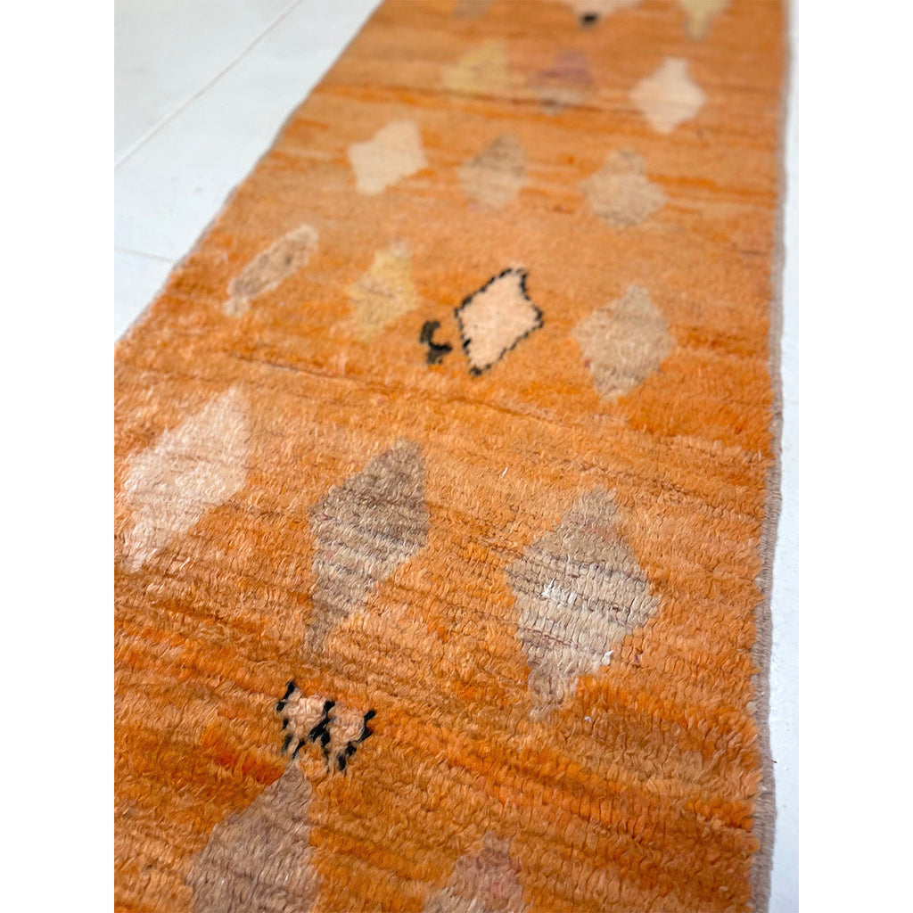 This orange Moroccan Boujad rug is faded to perfection. It provides the perfect backdrop for all of the different diamonds that spread throughout the piece. These smaller diamonds appear in a complimentary palette, featuring pastel shades of lavender, pink, yellow, and muted grey. Because of its size, this rug is quite versatile in terms of where you can place it. It could go well as a bedside runner, at the foot of the bed, in a smaller hallway, or in a kitchen or bathroom.